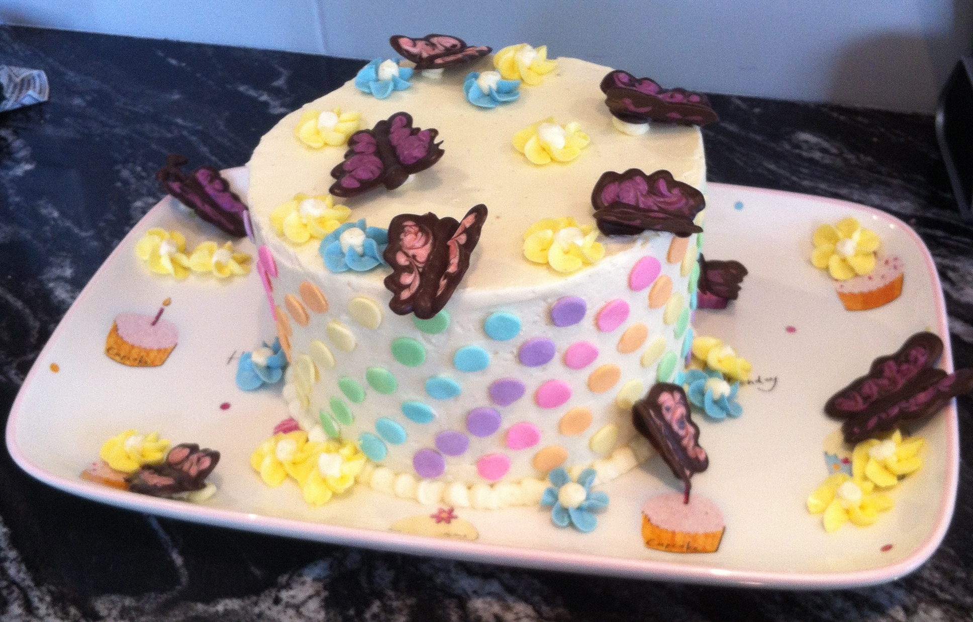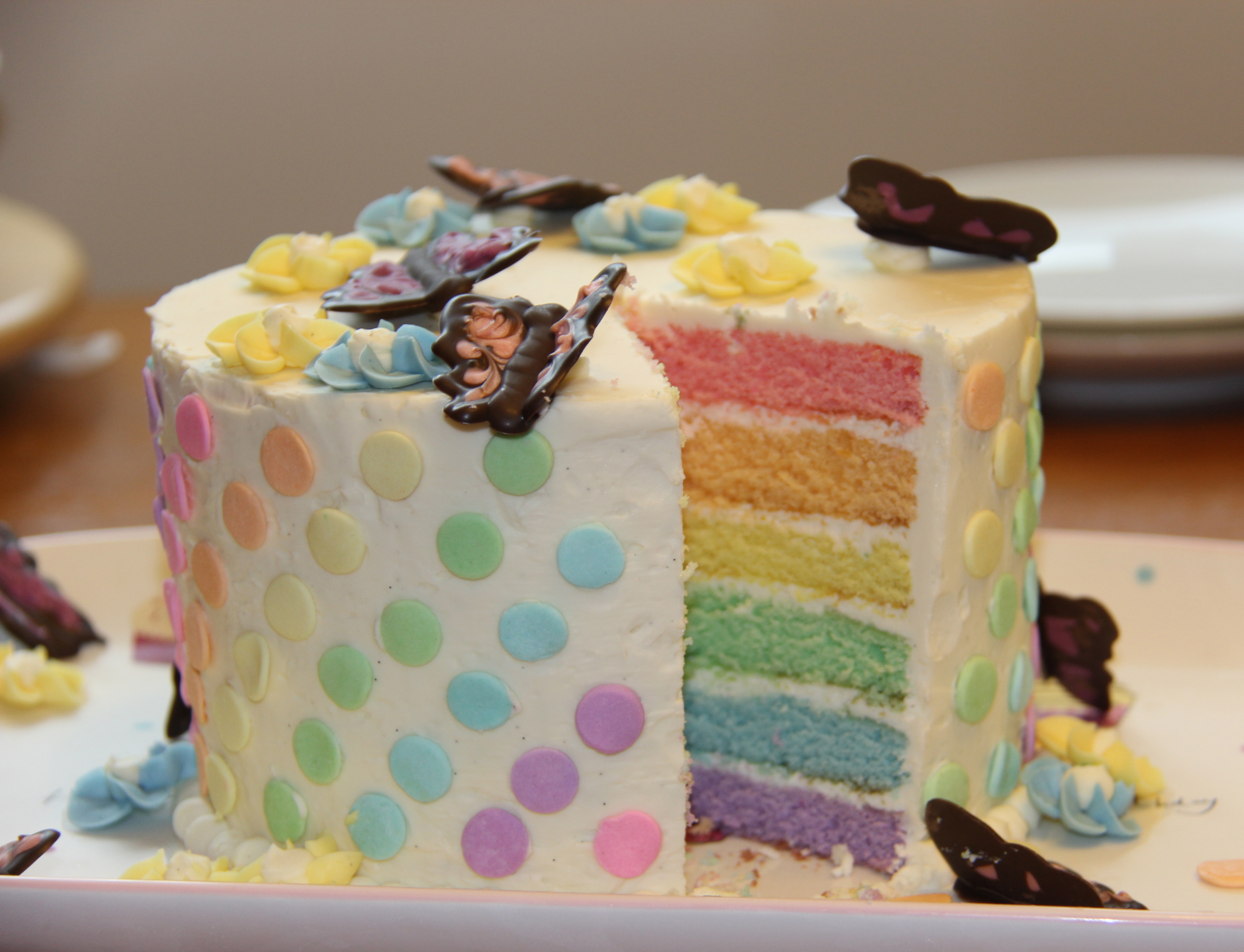 This is the birthday cake I made for my daughter on the occasion of her 4th birthday. I made the mistake of taking her onto Pinterest with me, to get some ideas for what I thought would be a butterfly-shaped cake with rainbow-coloured icing. We obviously got a little more elaborate than that. This is the post that inspired us: http://blog.hwtm.com/2013/02/playful-rainbow-butterfly-princess-party/