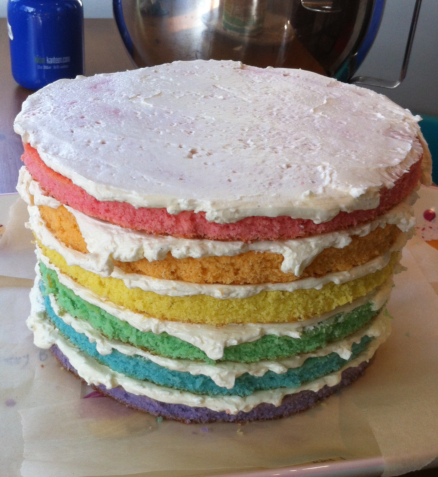 Yes, she convinced me that rainbow layers were the way to go. It wasn’t hard, I was up for the challenge. And heck, it was a long weekend. TONS of time, right? My birthday helper was keen to scoop out and level all our dry ingredients, stir in the colour, and of course lick the bowls (all 6), which made cleanup a snap. I opted for 6 layers instead of 8 – with only 2 cake pans of any given size it would’ve been a bit ridiculous otherwise. You might want to bookmark this page for ideas when my birthday comes around… But back to the cake.
