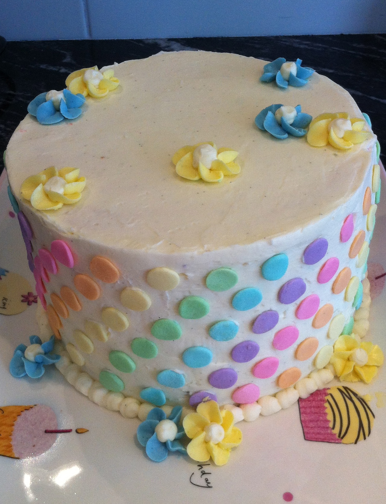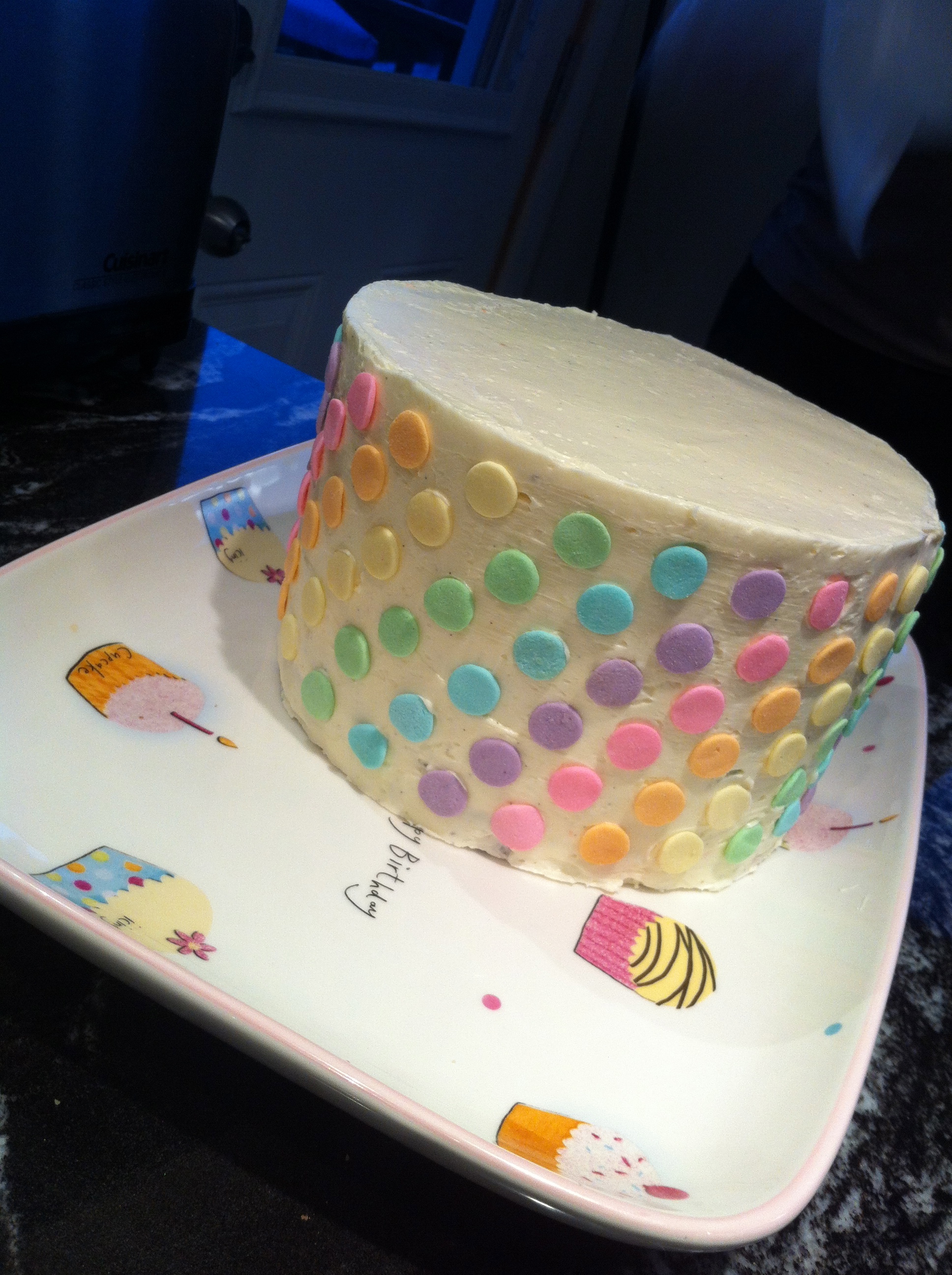 Next came the polkadots. I picked up some candy dots from Michaels in rainbow colours that happened to match our layers. Lucky! Saved me from messing with 6 colours of icing or melting chocolate. Plus this way, little hands could help.