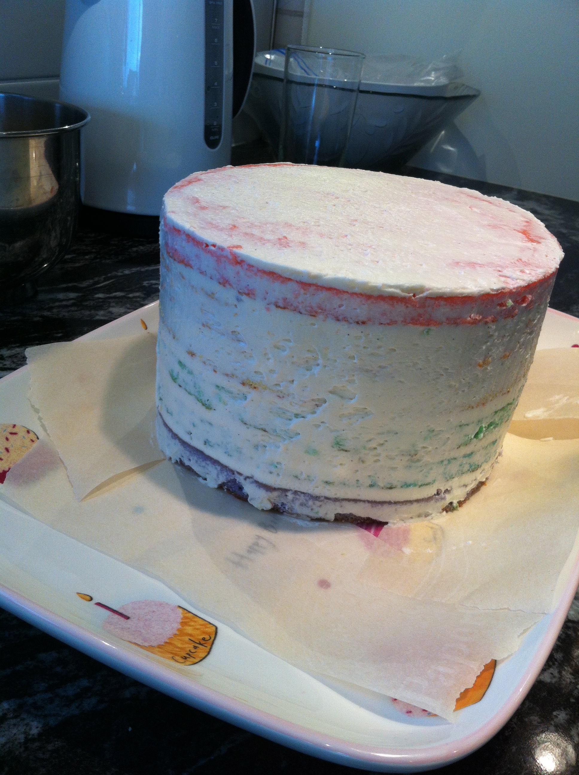 I chose an 8″ cake pan so our layers would be a little thicker, and I’d have enough real estate to level them off. We also tried to go as easy on the colour as the squeeze bottles would allow. Here’s the crumb coat: