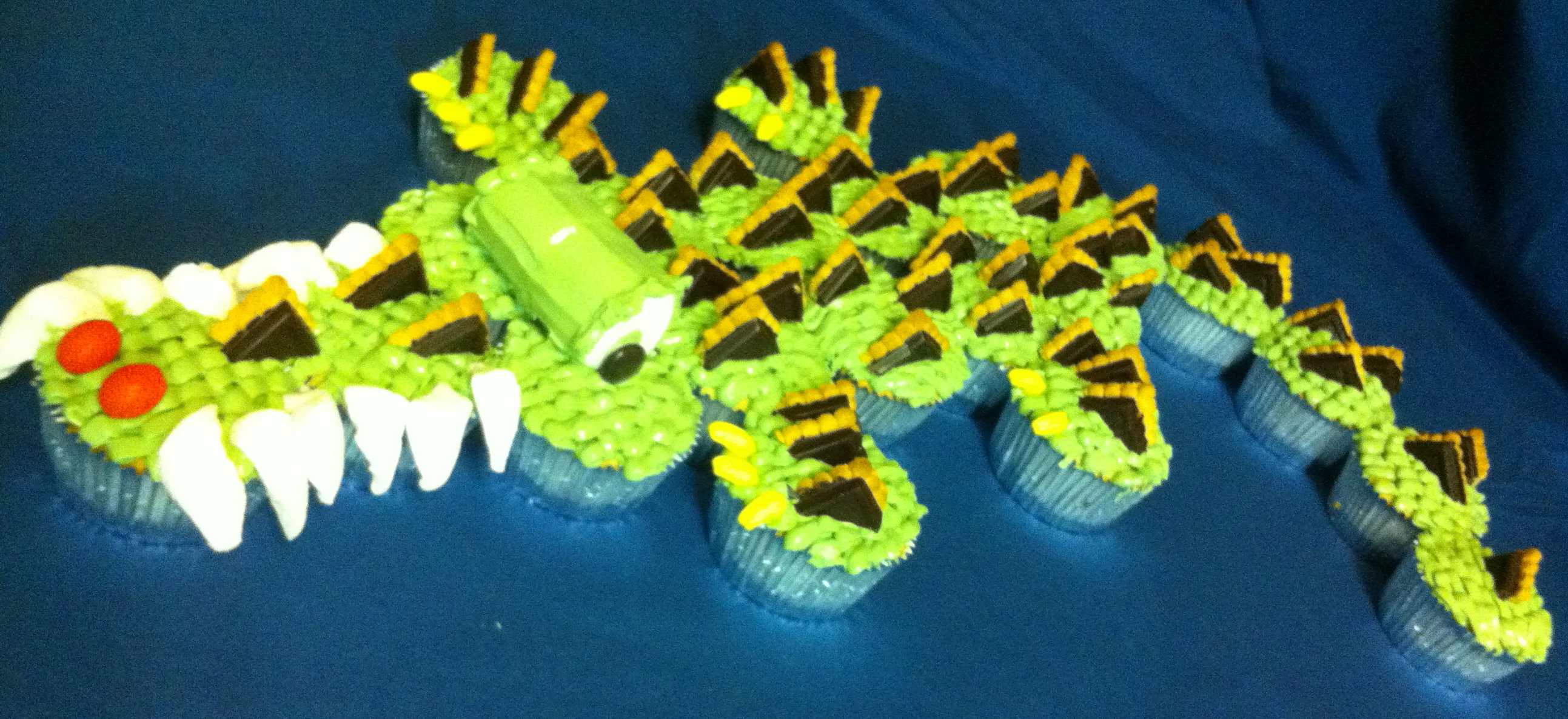 I’d just completed my first 3D cake (see Where’s Piglet?), and was on a baker’s high. Any excuse to try out a new design was good enough for me, including my husband’s birthday. He didn’t ask for anything special, and so he was quite surprised to walk into the kitchen to find this fierce creature swimming in a sea of blue.