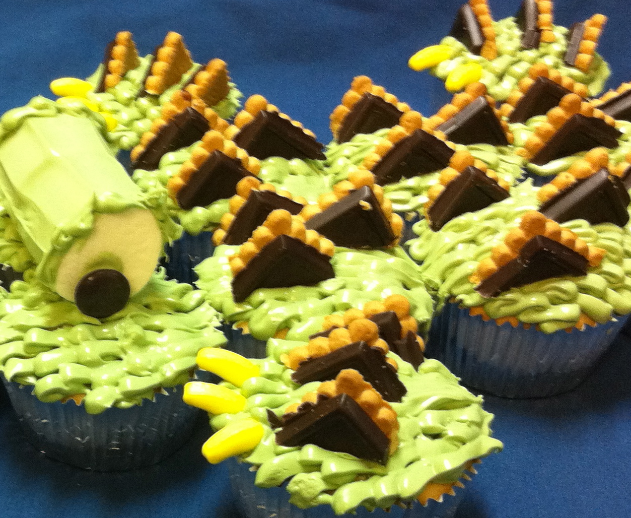 I didn’t get fancy with the cake batter (simple white cupcakes), because I knew I’d be piping up a storm of green icing. I had to search everywhere for square-shaped cookies that weren’t boring biscuits without much flavour or flare. My first rule of baking is that it has to taste good. I found these ones at Safeway, and had to deal with a fair amount of breakage during the prep phase, which I didn’t mind, since they happened to be covered in dark chocolate (my favourite).