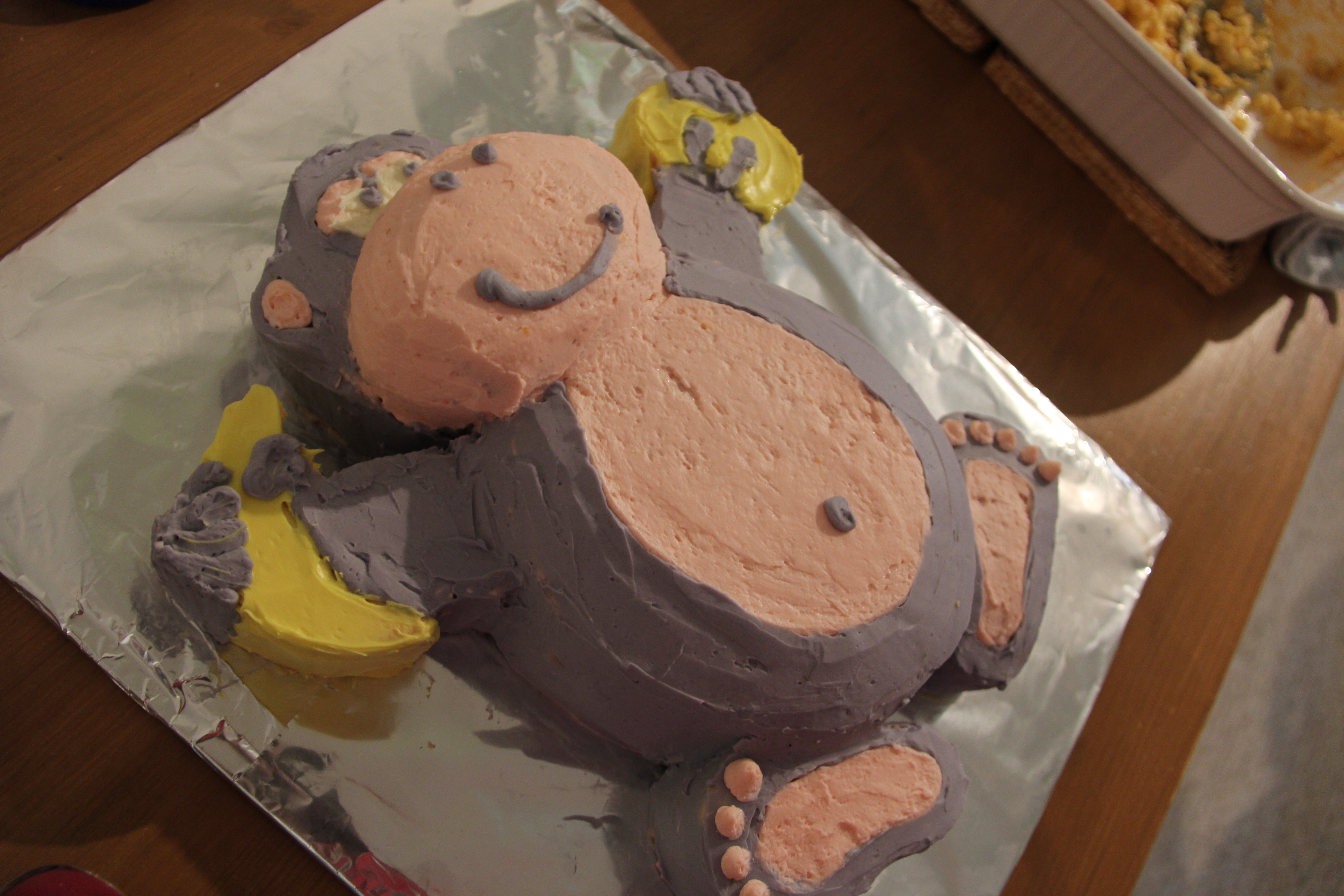 I made a basic white round cake, and cut, carved and arranged layers and limbs until it bore some resemblance to the doll. There was no science to the process, no calculations, just some freehand hacking – art at its best. For the icing, I chose a star tip to mimic the texture of the stuffy. For the eyes, I used Runts (clearly a choking hazard, which meant for safety’s sake, I was obliged to eat them – what a sacrifice!). I may have run out of icing when it came to the feet…I was too sleep-deprived to make another batch; I’m pretty sure the birthday girl didn’t notice.